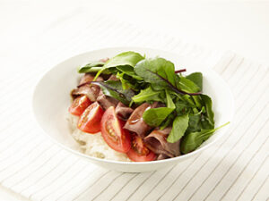 - 温かいごはんを器に盛り、ローストビーフとベビーリーフ、トマトをのせる